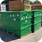 Упакованные товары в зеленой пленке с лейбламиЧерный уличный биотуалетБольшой синий цилиндр на газонеКруглый бассейн с синей водой